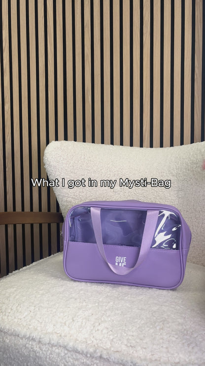 The Small Mysti-Bag is a lilac cosmetic bag filled with 3 surprise beauty products.